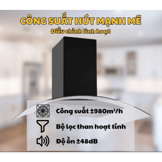 Công suất hút mạnh mẽ: ±980m³/h, đảm bảo loại bỏ hiệu quả khói và mùi khó chịu, mang lại không gian bếp trong lành.